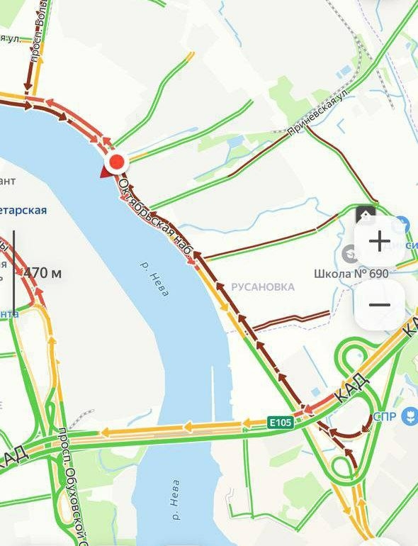 Пробка возникла в 7 утра, петербуржцы вынуждены стоять на этом участке не менее 1,5 часа. Причиной затрудненного проезда является ремонт, который оставил всего одну проезжую полосу.