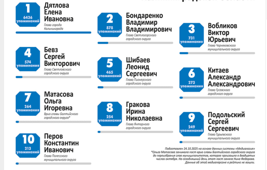 На основе данных аналитической системы «Медиалогия» за 2025 год составлен медиарейтинг руководителей муниципальных образований Калининградской области. Исследование провели до избрания глав шести муниципалитетов региона в октябре. Топ-политиков опубликовал «МК в Калининграде».