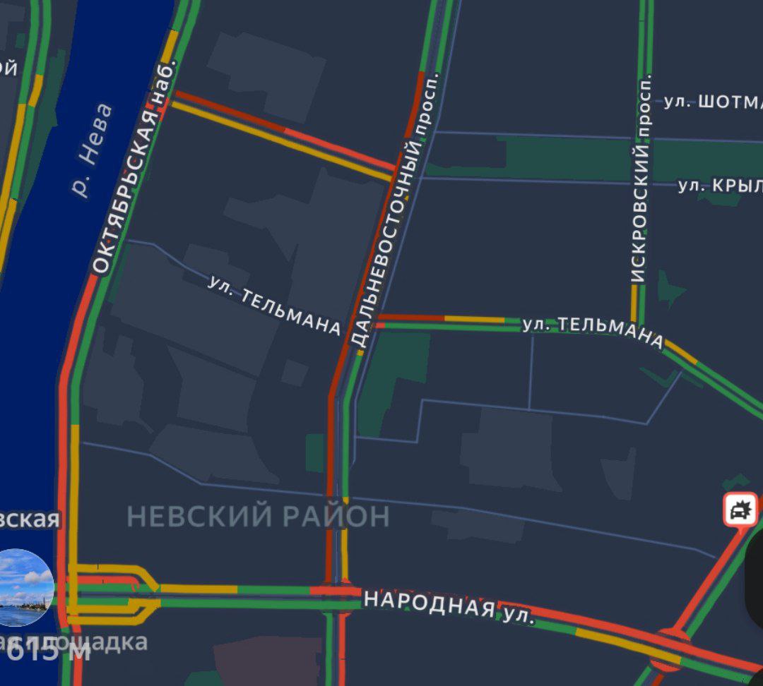 Бордовым на картах окрасился Невский район города. Пробка в 1,8 километра тянется по Дальневосточному проспекту, в 2,1 километра — по Октябрьской набережной.