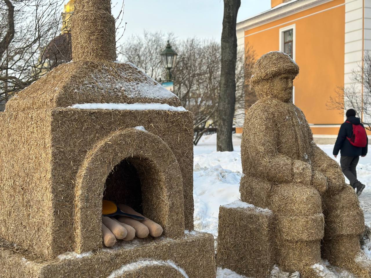 В этом году фестиваль «Сударыня Масленица» вышел за пределы Соборной площади. У главных ворот гостей встретили гигантские соломенные арт-скульптуры — персонажи русских сказок. Среди них: избушка на курьих ножках с Бабой-Ягой, медведь, лиса, Колобок и другие.
